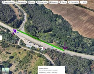 1. Освен че завоят е десен и не осигурява добра видимост , там има и няколко големи табели и дървета (вж. снимките), които допълнително затрудняват видимостта между двамата водачи. Т.е. ако при оптимални условия от максимална видимост между двамата водачи от 137-140 м, тук нещата са допълнително усложнени и е възможно пострадалият водач да е спрял на знак стоп, да е изчакал, и когато е тръгнал, да не е видял изобщо друга кола отляво.