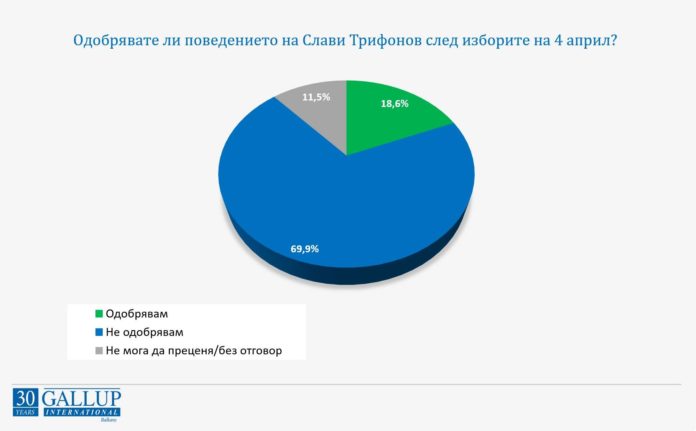 69,9% не одобряват поведението на Слави Трифонов след изборите на 4 април, сочи проучване на „Галъп“. Причината явно е това, че не беше направен опит за съставяне на правителство. 18,6% го одобряват, а останалите не могат да отговорят. И тук, става дума за очаквана партийна картина на отговорите: одобряващи Слави Трифонов са главно привържениците на формацията му и малка част от привържениците на ДБ и на ИСМВ. Закономерно, БСП в голямата си част не одобрява. Същото важи в още по-голяма степен за ГЕРБ.