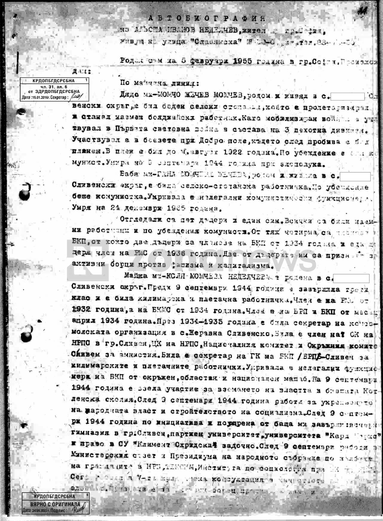 Роден съм на 5 февруари 1955 г. в гр. София. Произхождам по майчина линия: Дядо ми Момчо Жечев Момчев, родом и живял в с. Жеравна, Сливенски окръг, е бил беден селски стопанин, който е пролетаризиран и станал наемен бояджийски работник…По убеждение е бил комунист. Умира на 9 септември 1944 г. при злополука. Баба ми, Гана Момчева Жечева, родом и живяла в с. Жеравна, Сливенски окръг, е била селскостопанска работничка. По убеждение беше комунистка. Укривала е нелегални комунистически функционери. Умря на 24 декември 1965 г. Отгледали са пет дъщери и един син. Всички са били наемни работници и по убеждение комунисти…Две от дъщерите им са признати за активни борци против фашизма и капитализма. Майка ми, Коля Момчева Неделчева е родена в с. Жеравна, Сливенски окръг. …Член е на РМС от 1932 г., а на БКМС от 1934 г. Член е на БРП и БКП от месец април 1934 г. През 1934-1935 г. е била секретар на комсомолската организация в с. Жеравна, Сливенско…Била е секретар на ГК на БКП. Укривала е нелегални функционери на БКП от окръжен, областен и национален мащаб. На 9 септември 1944 г. е взела участие в завземането на властта в бившата Котленска околия (това със сигурност означава, че е трепала наред в онези безотговорни дни, бел.ред.). След 9 септември 1944 г. работи за укрепването на народната власт и строителството на социализма….След 9 септември работи в Министерски съвет и Президиума на Народното събрание по жалбите на гражданите в НРБ, Института по социология…По бащина линия: Дядо ми, Георги Неделчев Банов, роден в с. Първенец, Ямболско, е бил ратай до оженването му…основава за пръв път в родното си село партийната организация на БРСДП (т.с.) На 25 май 1919 г. той е бил делегат на XXII конгрес на БРСДП (т.с.) – първия конгрес на БКП. Заради революционната си дейност като комунист той е осъден от военния съд на 7 години и 6 месеца строг тъмничен затвор. Присъдата изтърпял в Сливенския затвор от м. септември 1923 г. до края на м. декември 1928 г. В затвора фашистката власт организира убийството му, като му е нанесена дълбока рана с нож в областта на сърцето…От 1929 г. до 9 септември 1944 г. той е укривал нелегални функционери на БКП от окръжен, областен и национален мащаб: членове на ОК на БКП-Сливен, инструктори и членове на ЦК на БКМС и ЦК на БКП. Умира на 12 декември 1962 г. Баща ми, Иван Георгиев Неделчев е роден в с. Първенец, Ямболски окръг…В революционната борба участва от 1923 г. През Септемврийското въстание 1923 г. той спасява живота на 5 активни комунисти от избиване от цанковите фашистки банди, като ги укрива в дома си…От 1927 г. е член на БКМС, а от 1931 г. – на БКП. Основател и ръководител на марксистко-ленинските кръжоци и на БКМС в Сливенската мъжка гимназия „Д.П. Чинтулов“ През 1931-33 г. е бил секретар на ОК на БКМС-Сливен и член на ОК на БКП-Сливен. През 1933-1937 г. е бил член на ОК на БКП-Сливен, като през това време е бил нелегален с присъда. През 1937-1939 г. е бил политически затворник. През 1943-1944 г. е бил в концентрационен лагер , като през същите години е бил член и секретар на ОК на БКП-Сливен…Бил е ръководител и лично е взел участие във вземането на властта на 9 септември 1944 г. в Сливенския партиен окръг. След 9 септември 1944 г. е изпратен от ЦК на БКП във войската като политически офицер…през 1946 г. завършва веонното училище „Васил Левски“ с отличен успех. През 1947 г. завършва специални свързочни курсове за изучаване на свързочна
