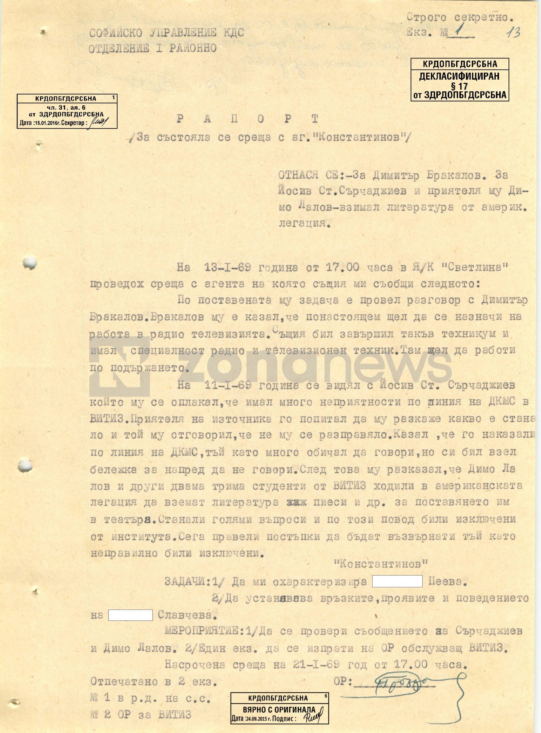 На 11.01.69 г. се видял с Йосиф Ст. Сърчаджиев, който му се оплакал, че имал неприятности по линия на ДКМС във ВИТИЗ. Приятелят на източника (това е самият доносник, но в документите са били задължени да пишат, че информацията е от техен приятел, бел. ред.) го попитал да му разкаже какво е станало и той отговорил, че не му се разправяло. Казал, че го наказали по линия на ДКМС, тъй като много обичал да говори, но си бил взел бележка за напред да не говори. След това му разказал, че Димо Лалов и дрги двама-трима студенти от ВИТИЗ ходили в американската легация да вземат литература, пиеси и др. за поставянето им в театъра. Станали големи въпроси и по този повод били изключени от института. Сега правили постъпки да бъдат върнати, тъй като били неправилно изключени. В следващо донесение топи друг свои приятел, че участва в нелегална група и има в дома си пистолет. Онези, които сме живели в онова време знаем со болка какво означаваше за жертвата подобен донос.