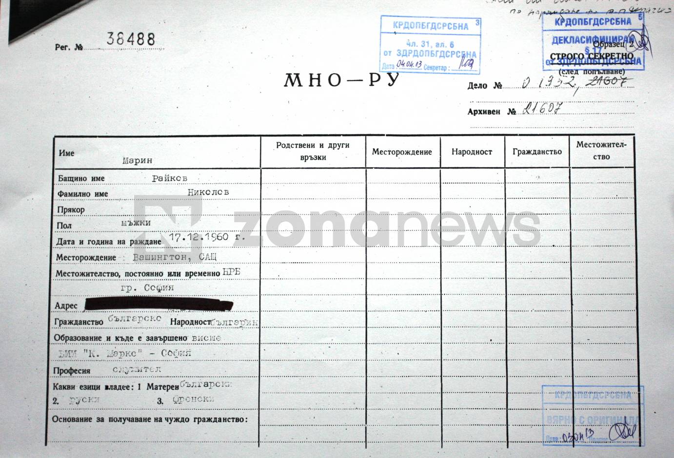 Нашата информация е, че през лятото на 1997 г. първата комисия по досиетата на Богомил Бонев открива, че досието на Марин Райков в РУМНО е съхранено напълно. Райков научава това и изпада в потрес, среща се с тогавашния шеф на военното разузнаване ген. Ангел Кацаров и настоява да бъде покрит. Кацаров лично отива при тогавашния „десен“ премиер Иван Костов, обяснява му казуса, колко е деликатна ситуацията и делото е скрито. Марин Райков не е обявен.