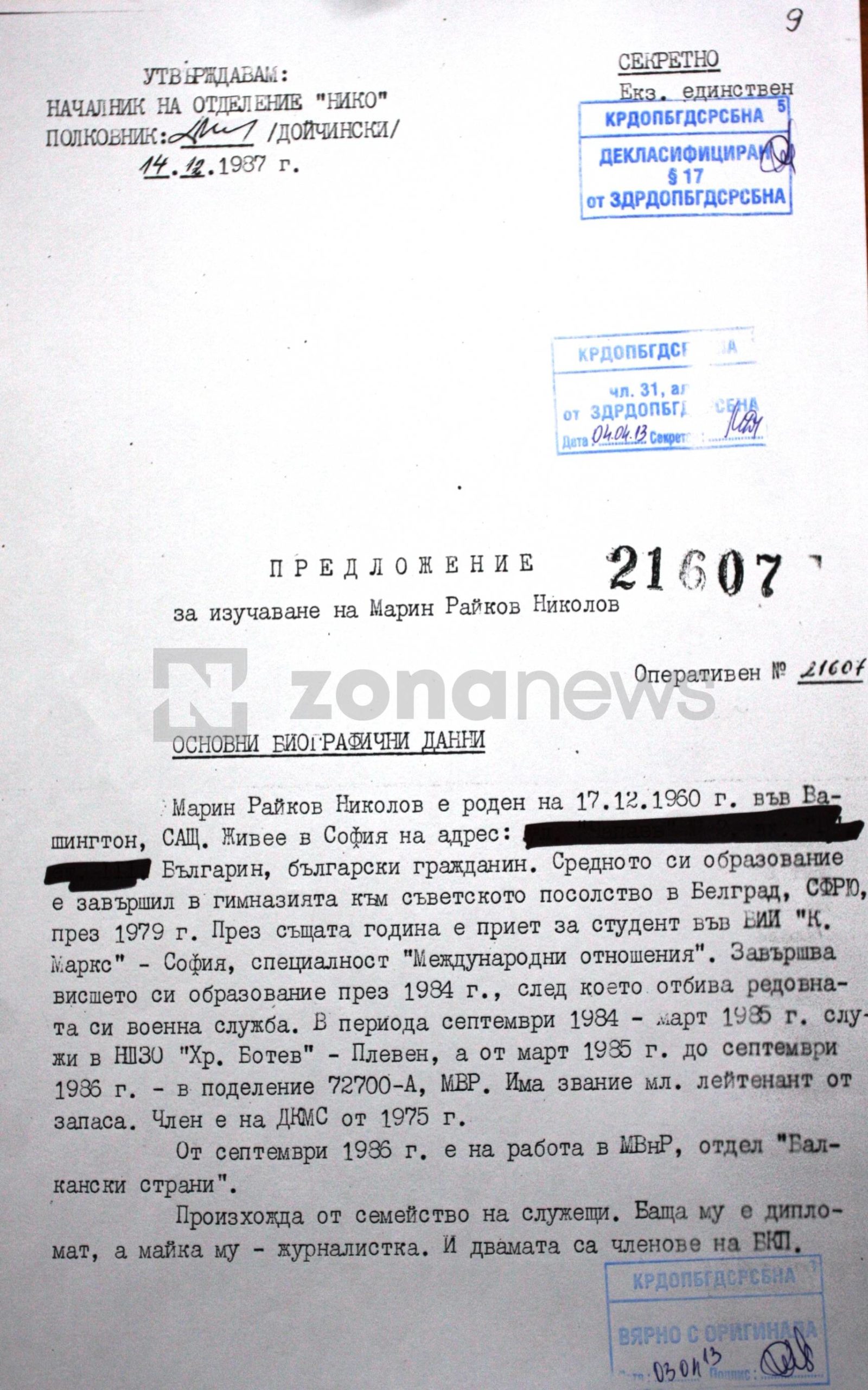 „Марин Николов произхожда от прогресивно семейство. Има правилен марксистко-ленински мироглед, солидна теоретична подготовка по специалността си…Служебното му положение като служител в отдел „Балкански страни“ на МВнР му дава възможност за известни контакти с представители на тези страни у нас и за достъп до постъпващите в МВнР информационни материали по тези страни. В перспектива е вероятно излизането на лицето на задгранична работа в балканските или други представляващи интерес за нас страни. Посочените по-горе съображения определят оперативния интерес към лицето“.
