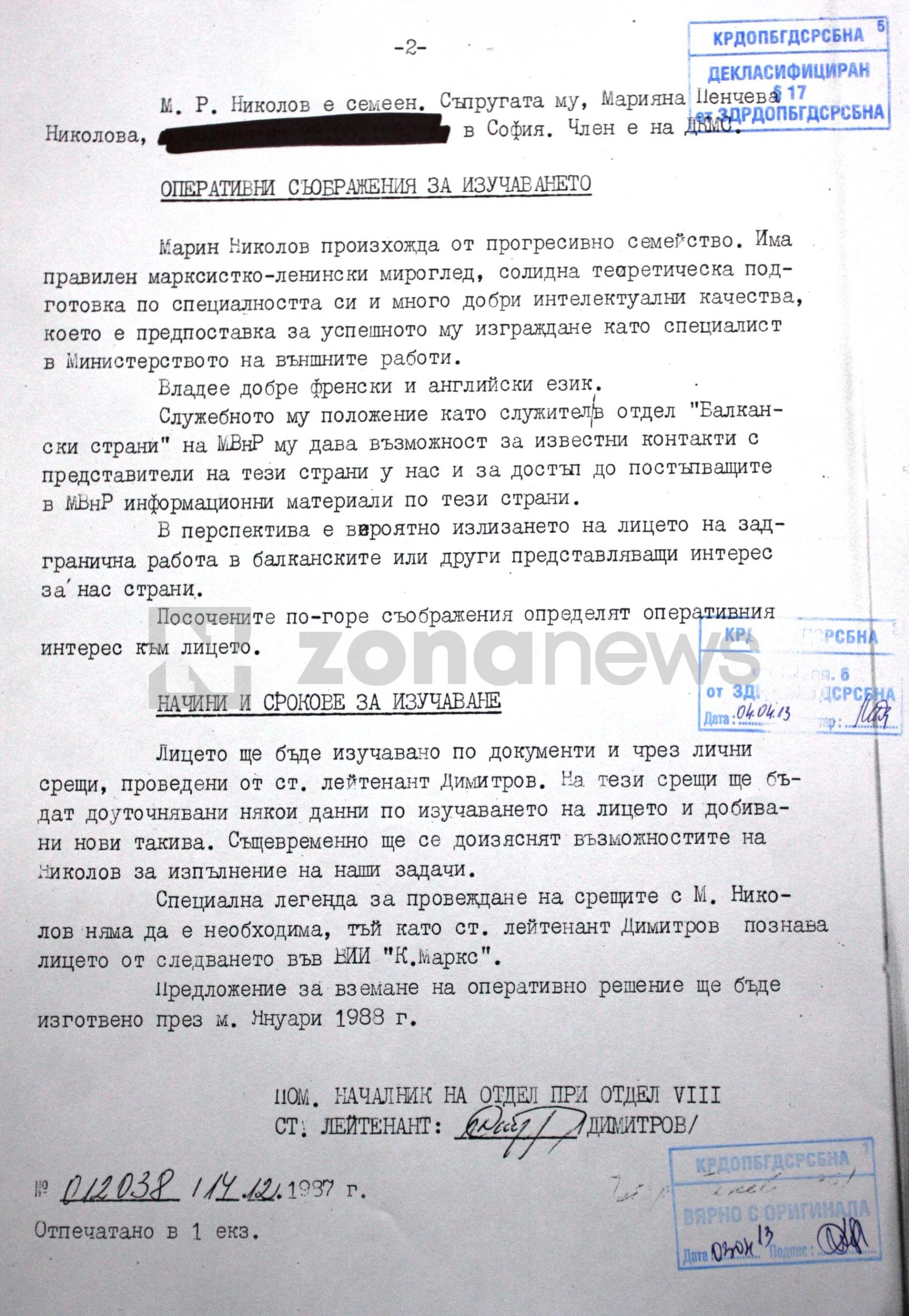 „Лицето ще бъде изучавано по документи и чрез лични срещи, проведени от ст.лейтенант Димитров. На тези срещи ще бъдат доуточнявани някои данни по изучаването на лицето и добиването на нови такива. Същевременно ще се доизяснят възможностите на Николов за изпълнение на наши задачи. Специална легенда за провеждане на срещите с М. Николов няма да е необходима, тъй като ст.лейтенант Димитров познава лицето от следването във ВИИ „Карл Маркс“. Предложение за вземане на оперативно решение ще бъде изготвено през м.януари 1988 г.“.