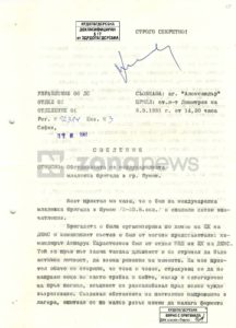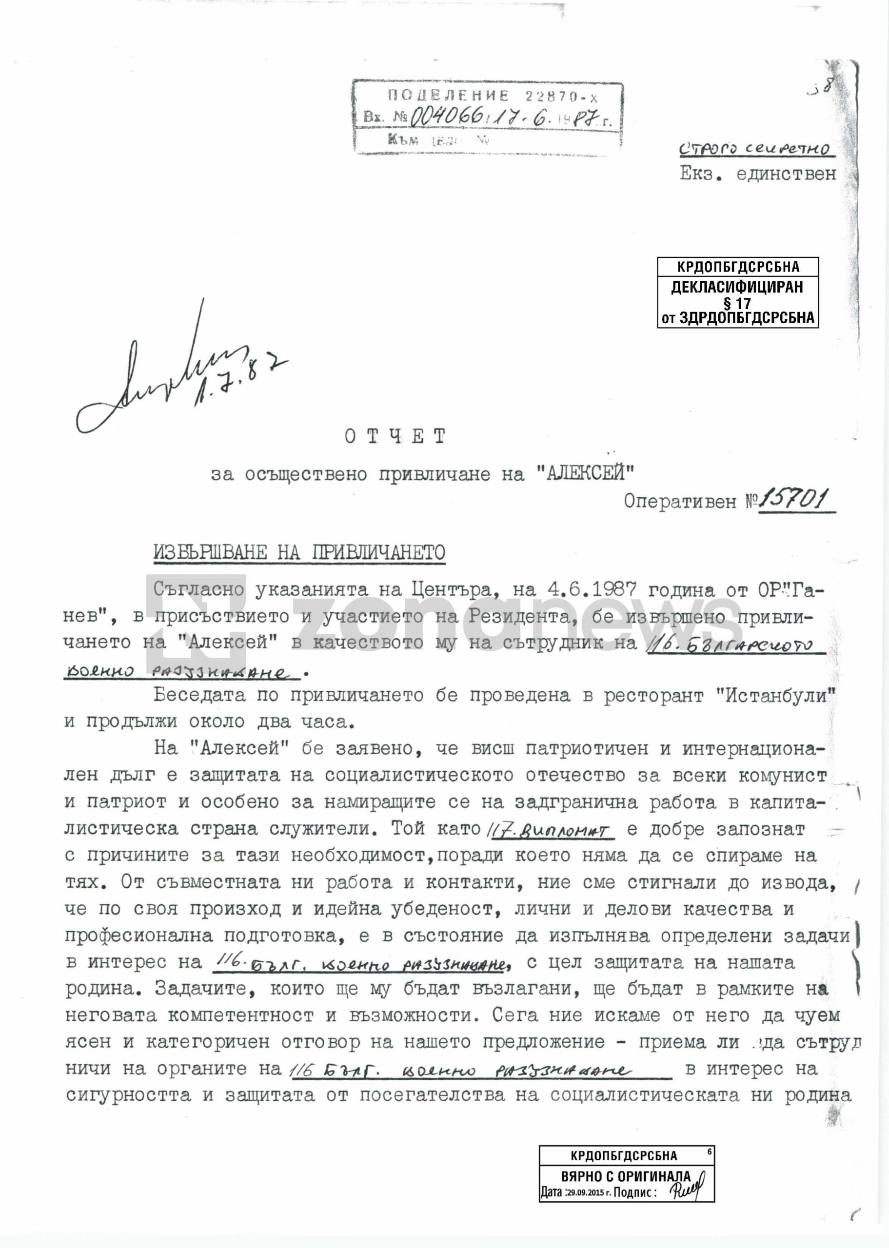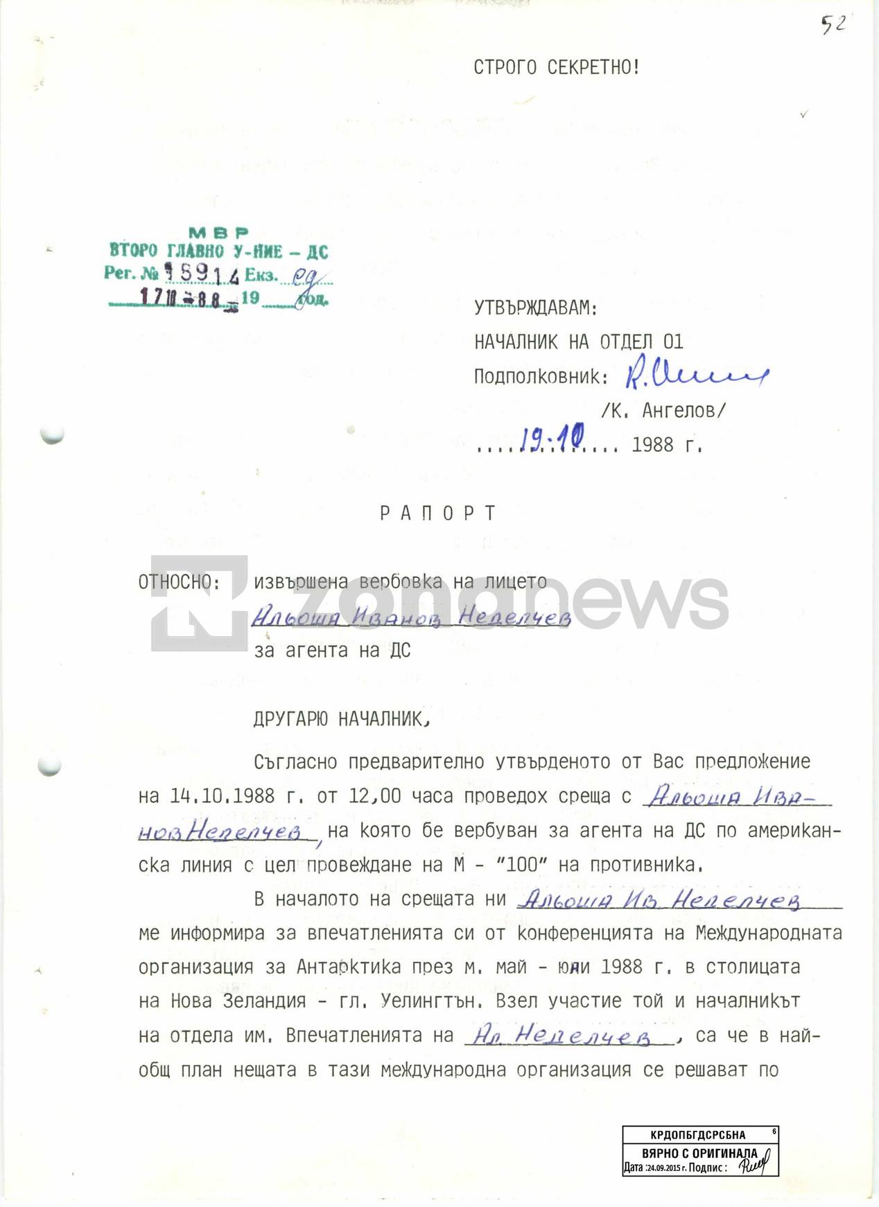 Съгласно предварително утвърденото от Вас предложение на 14.10.1988 г. от 12.00 часа проведох среща с Альоша Иванов Неделчев, на която бе вербуван за агент на ДС по американска линия с цел провеждане на М-100 на противника…“ А сега, внимание – този тип е изключен от агентурния апарат на службите чак през 1991 г.!!!