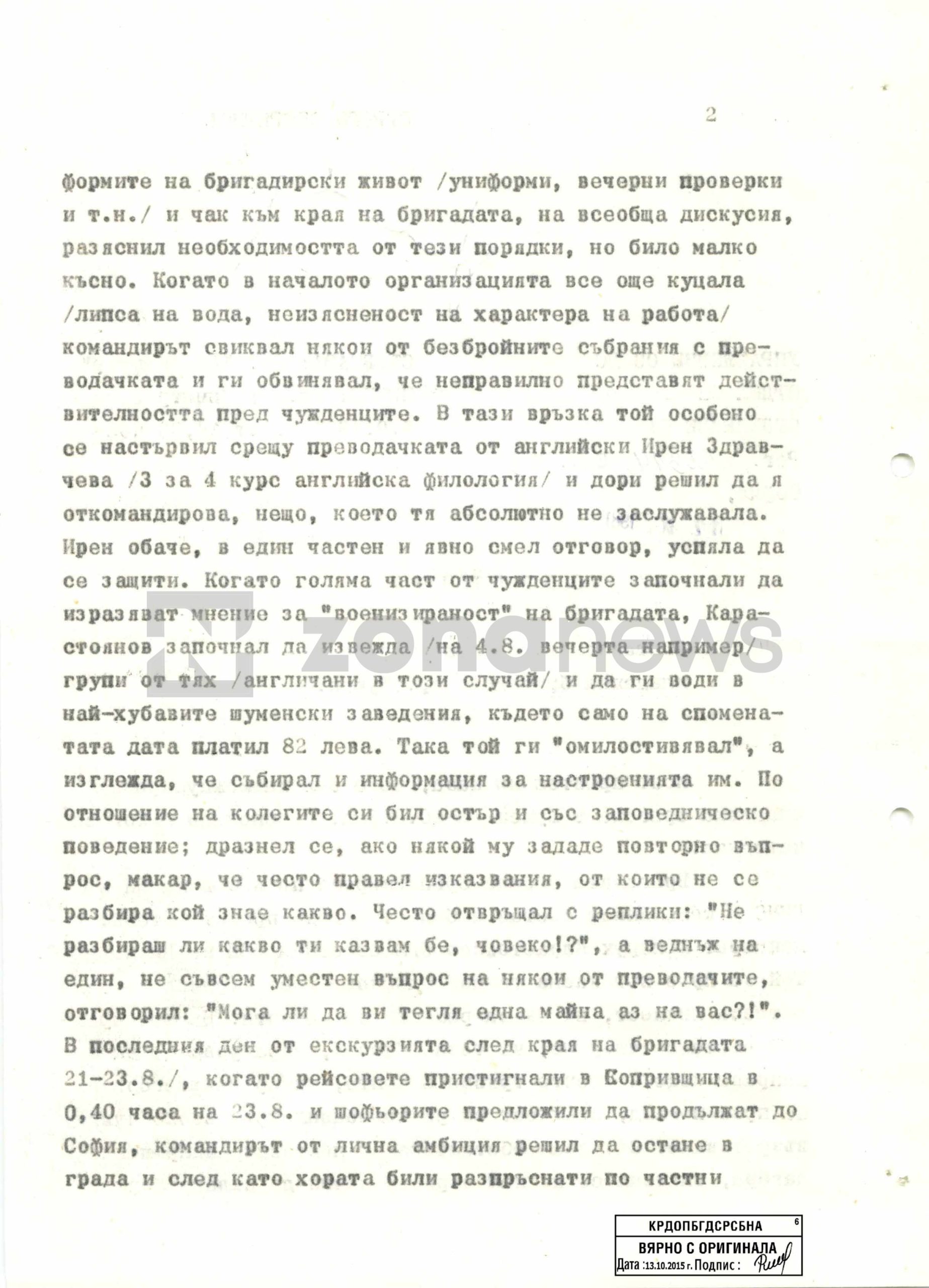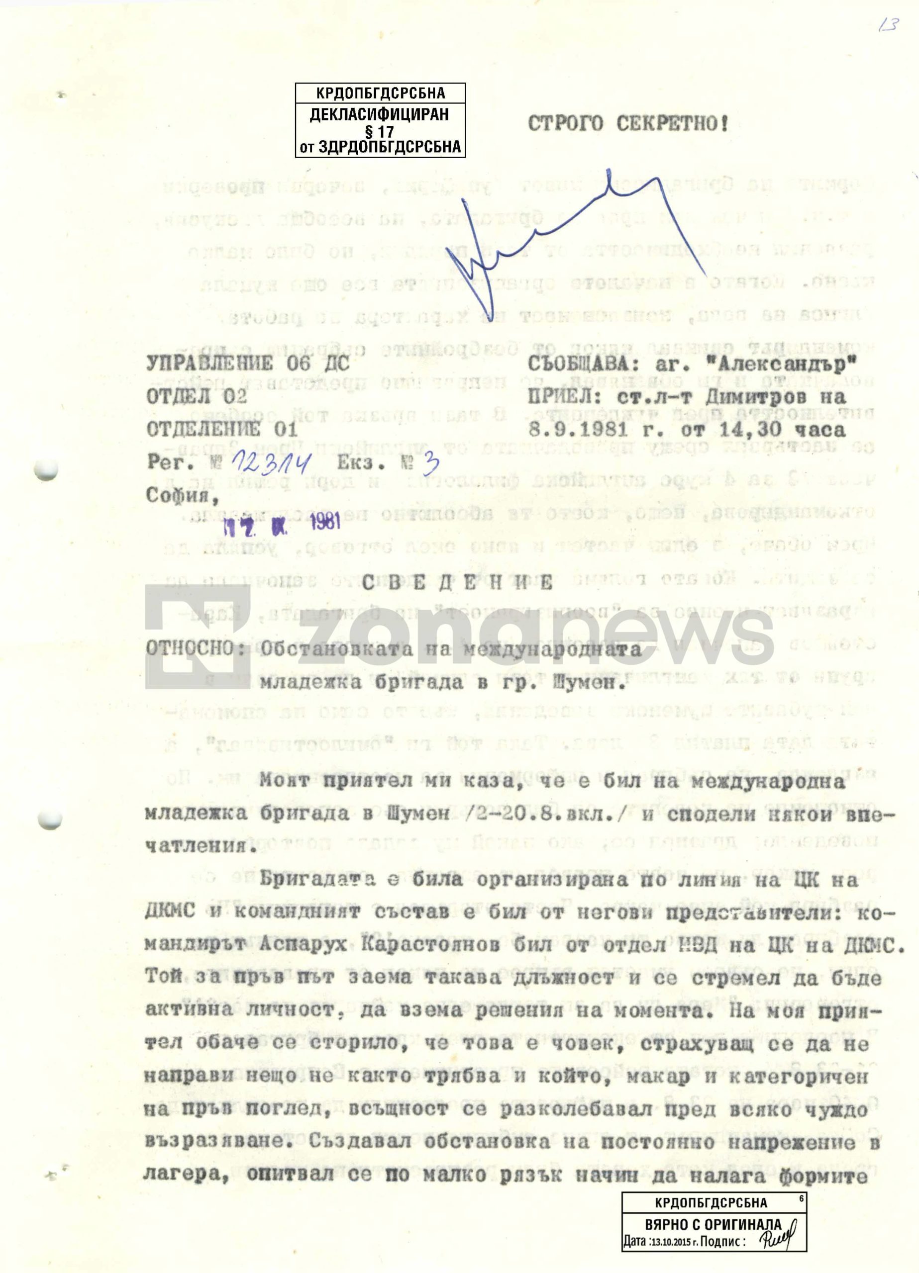 През септември 1981 г. агентът е изпратен на международна младежка бригада в Шумен. Бригадата е била организирана по линия на ЦК на ДКМС и командният състав е бил от негови представители: командирът Аспарух Карастоянов е от отдел „ИВД“ (Идейно-възпитателни дейности) на ЦК на ДКМС. Аспарух Карастоянов е съпругът на някогашния депутат от „Патриотичния фронт“ Полина Карастоянова.