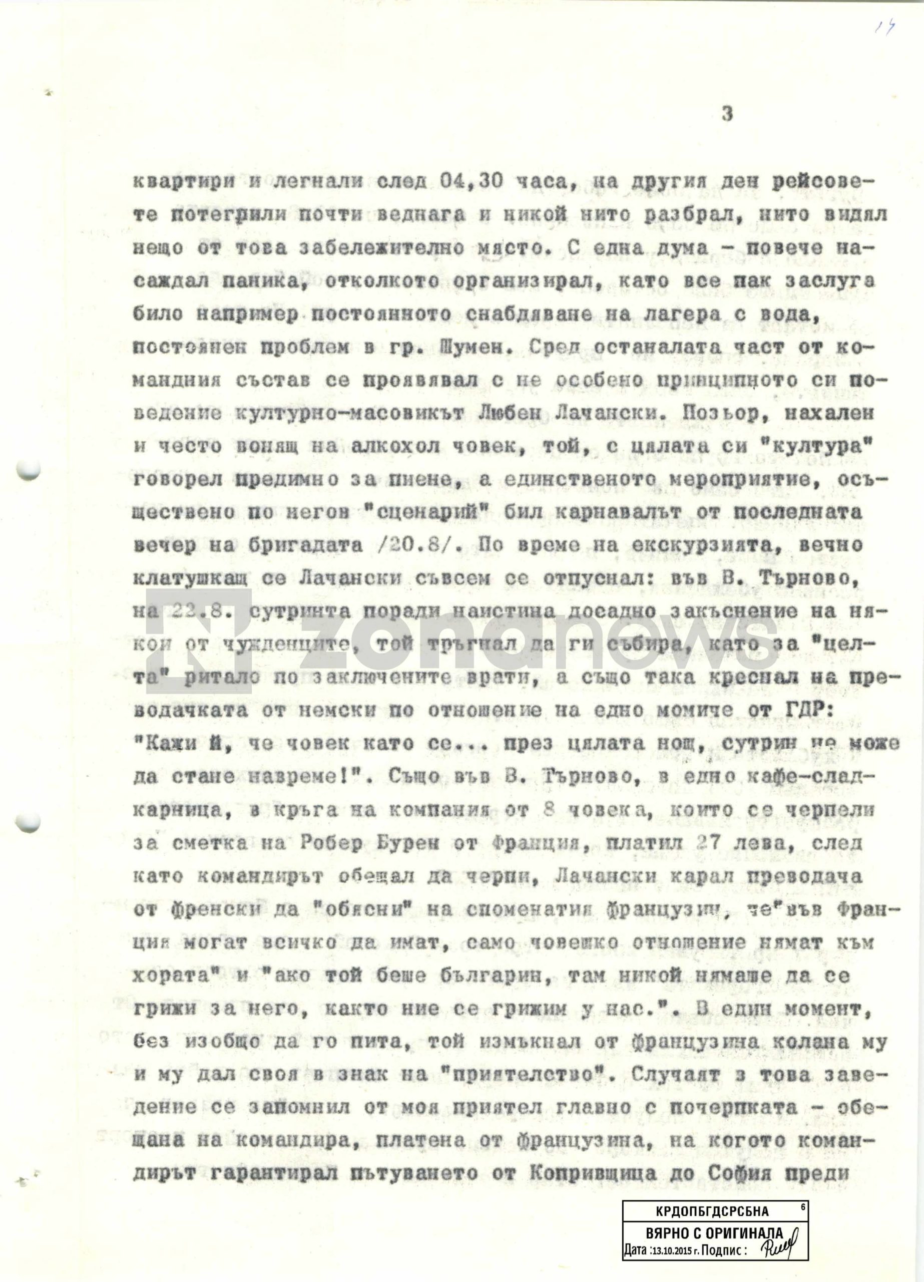 „Позьор, нахален и често вонящ на алкохол човек, той, с цялата си „култура“ говорел предимно за пиене, а единственото мероприятие, осъществено по негов „сценарий“ бил карнавалът от последната вечер на бригадата (20.08.). По време на екскурзията, вечно клатушкащ се, Лачански съвсем се отпуснал: във В. Търново, на 22.08. сутринта поради наистина досадно закъснение на някои чужденци, той тръгнал да ги събира, като за „целта“ ритал по заключените врати, а също така креснал на преводачката от немски по отношение на едно момиче от ГДР: Кажи й, че човек като се … през цялата нощ, сутрин не може да стане навреме!“.