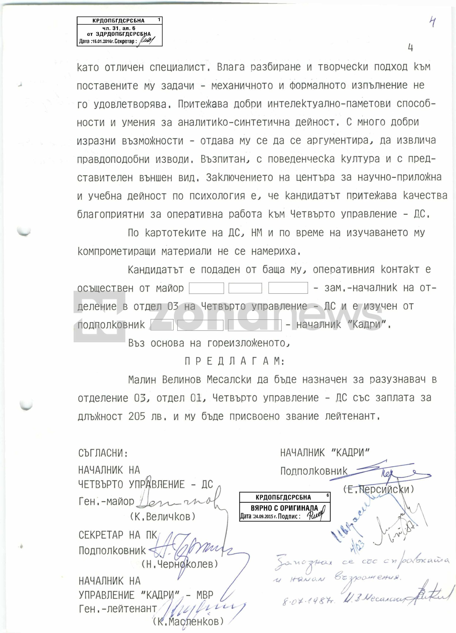 Пак на 1 април 2001 г. Надежда Михайлова издига в кариерата поредно ченге, този път кадрови офицер от Четвърто управление на Държавна сигурност. Малин Велинов Месалски се казва. Роден е на 16 май 1961 г. в гр. Елена.
