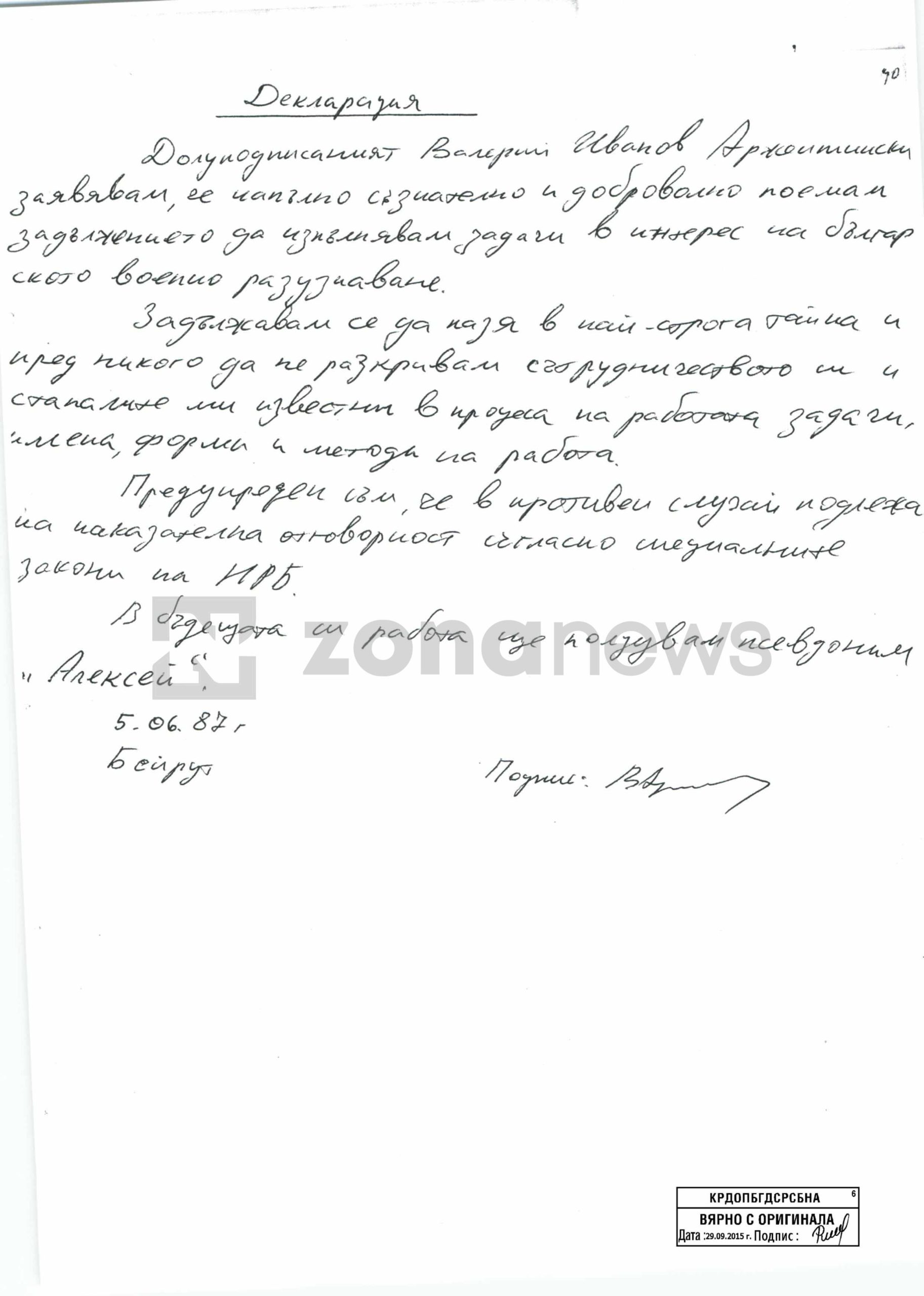 „Срещата се проведе във време на движение…Договорено беше, че в случаите, когато има покриване на тематиката с тази по линия на прикритието му, ще се работи приоритетно за нашите цели. Сътрудникът прие поставените му задачи без възражение..ИЗВЪРШЕНИ РАЗХОДИ. При провеждане на срещата за почерпка бяха изразходвани 3 300 ливански лири. По случай новата година на „Алексей“ беше връчен подарък-бутилка коняк „Плиска“…