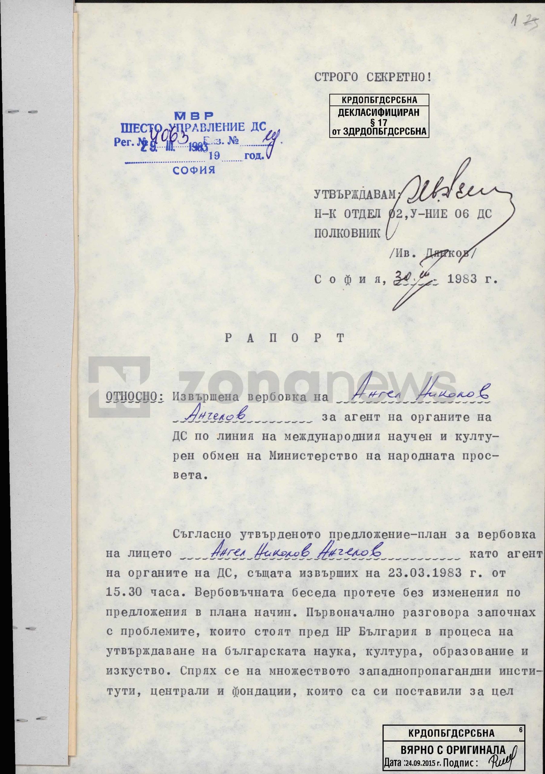 „След като от предишните контакти и разговори се бях убедил в правилния марксистко-ленински мироглед на Ангелов, определих мястото и ролята на всеки доблестен и честен гражданин на НРБ в сигнализирането, изясняването, предотвратяването и пресиченето на подобни действия… От разговора си изясних, че становището на кандидата за сътрудничество с органите на ДС е положително и пристъпих към официално предложение за такова. Ангел Н. Ангелов се съгласи да сътрудничи с органите на ДС и да дава информация по интересуващи ни въпроси“.