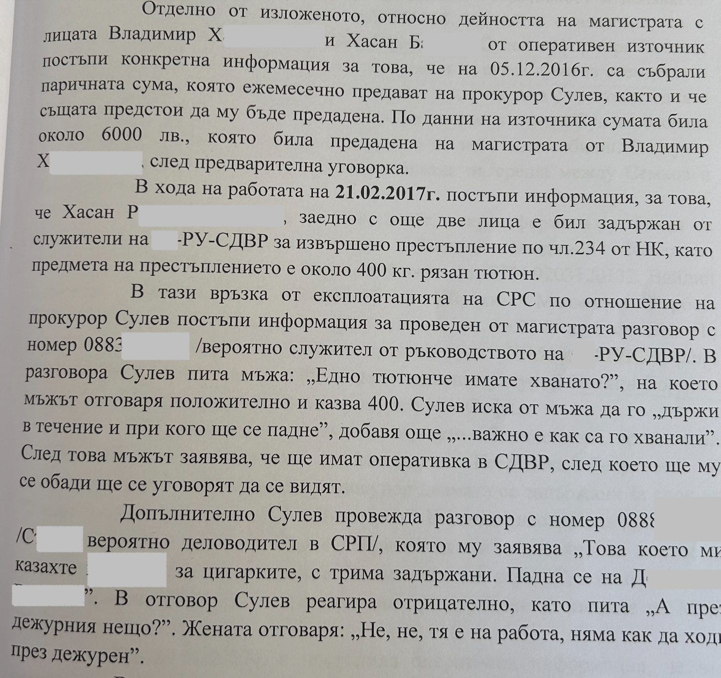 Когато преди години държавното обвинение разследва Константин Сулев, който е бивш служител на ГДБОП, звеното за противодействие на корупцията в ДАНС установява серия от меко казано „неприемливи контакти“ и „проблемни връзки“ на магистрата с лица от криминалния спектър. Нещо повече, контраразузнаването е категорично, че Сулев е получавал по 6000 лв. от търговци на фалшиви цигари месечно срещу осигуряването на чадър за незаконната им дейност.
