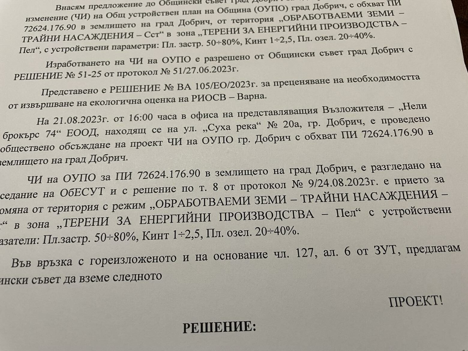 На 19 септември 2023 година в дневния ред на сесията на общинския съвет в Добрич е внесена докладна записка №39 от кмета Йорданов, с която той предлага на Общинския съвет да одобри частично изменение на Общия устройствен план на Добрич с обхват ПИ 72624.176.90 в землището на града, от територия „обработваеми площи земи-трайни насаждения“ в зона „ терени за енергийни производства“.