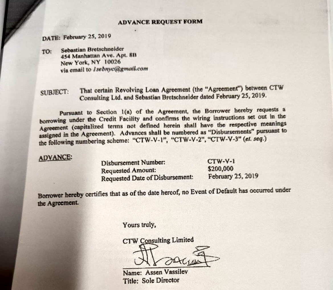 Бретшнайдер предоставя общо 1 477 000 долара, като първоначалният договор за револвиращ кредит със CTW Consulting Ltd. е за 1 млн. долара и е сключен на 25 февруари 2019 г.