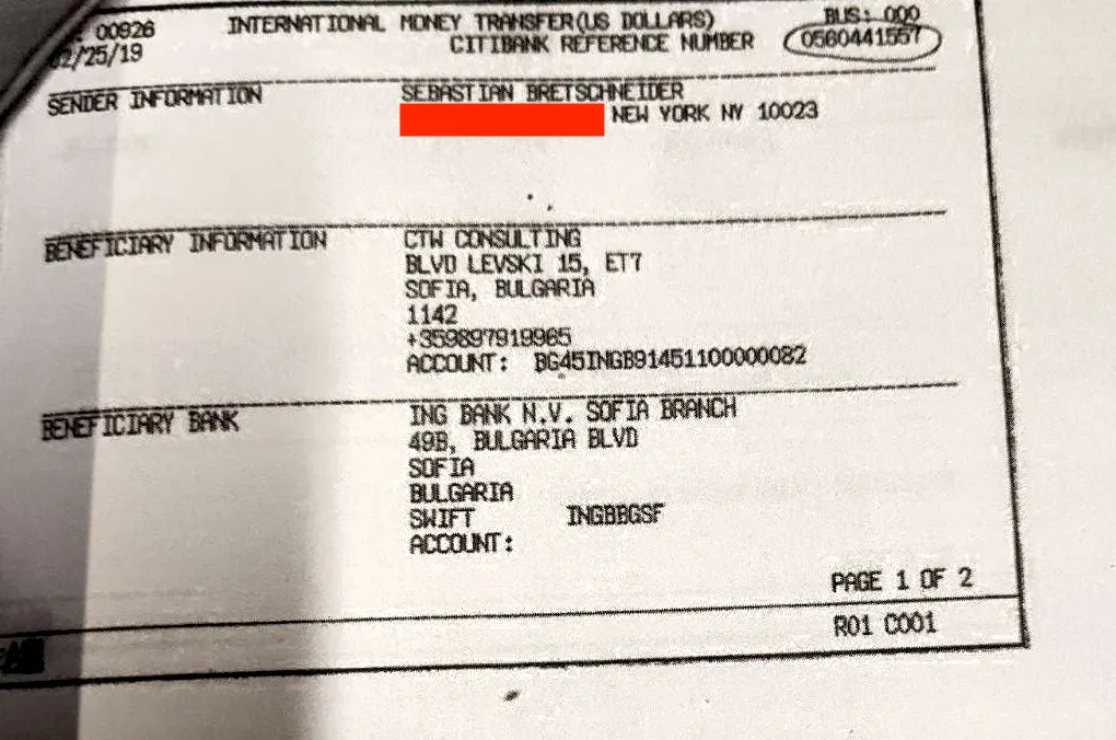 Първото плащане по договора е осъществено още същия ден – 25 февруари 2019 г. Бретшнайдер превежда цялата сума с още няколко транша: 29.02.2019г. – 500 000 долара, 10.09.2019г. – 120 000 долара и на 26.11.2019г. – 180 000 долара.