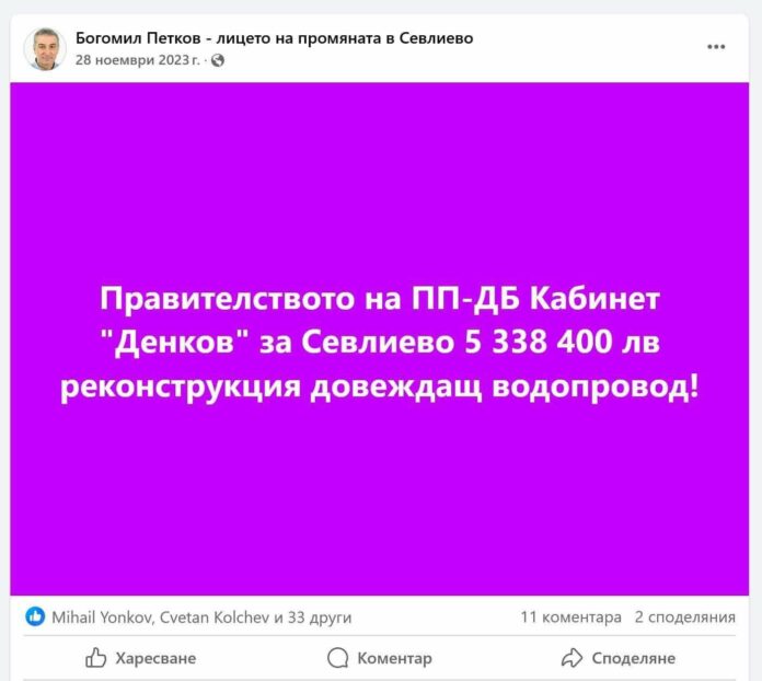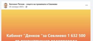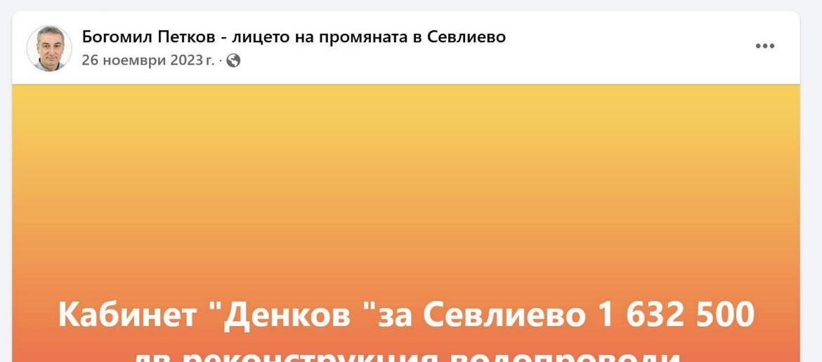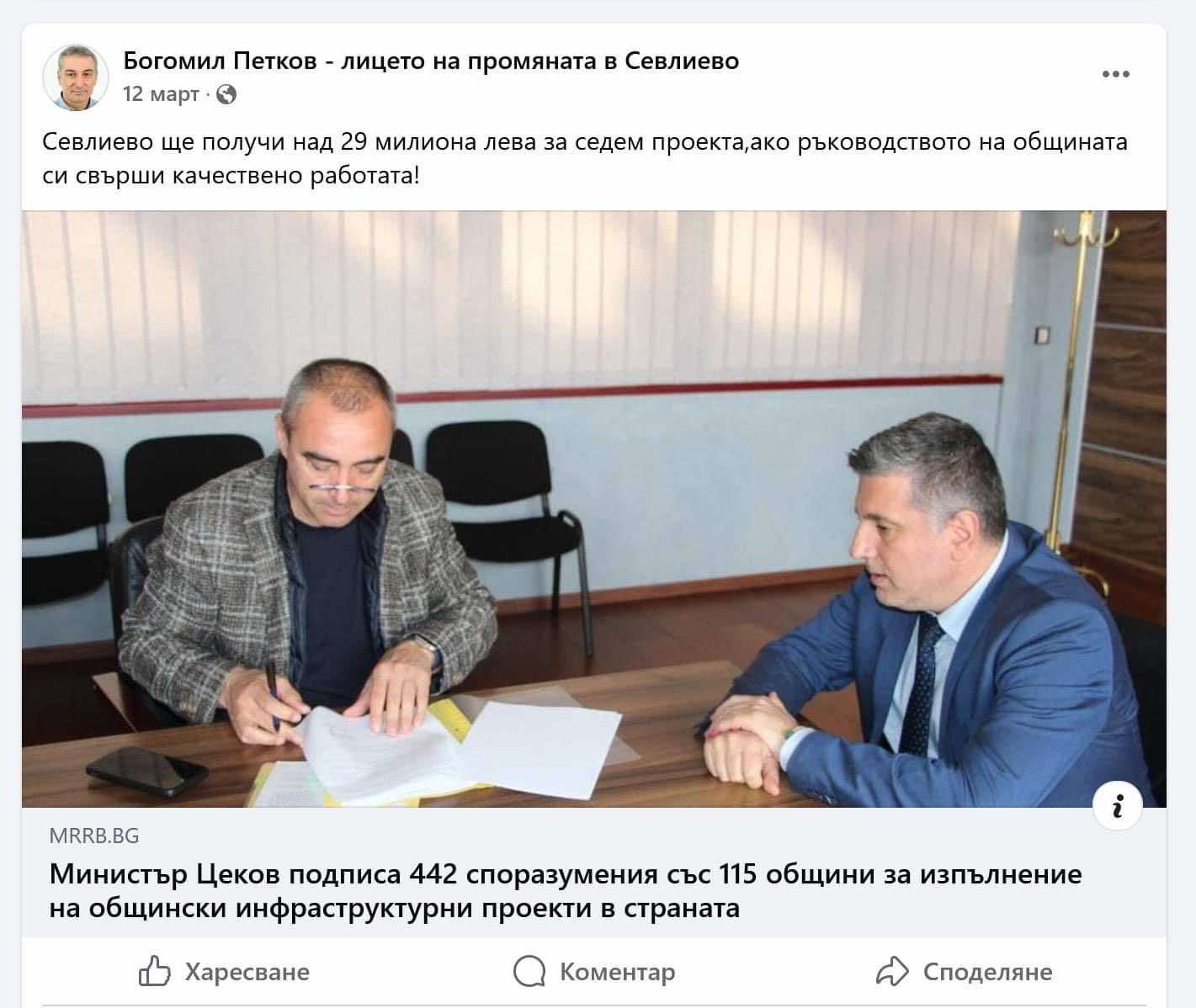 Отново за общински проекти, директно финансирани от държавата. На 12 март т.г. в интернет парите се стопяват до 29 млн. лв., след което фокусът се мести към обходния път, защото настава суша, а в Севлиево е въведен временен режим на водата и недай Боже някой да се сети точно преди изборите за обещаните от депутата седем цифрени суми, от които няма и следа, защото през цялото време Богомил Петков си е правил ала-бала с водата.Кой е Богомил Петков?Замогва се по време на прехода, като приватизира бетоновия възел в града, твърди се – с пари от червените куфарчета. По-късно започва да развива разнообразна дейност, благодарение на тежка техника и евтина работна ръка. Последователно кандидат за кмет от левицата, после и за депутат от Продължаваме промяната в Габрово и Силистра. Заподозрян е, че чрез семейството си е присвоил няколко милиона евро по програми на европейски фондове, посочвайки пред европейските институции неверни данни за търговските си дружества и такива свързани с него, твърди сайтът razkritia.com.