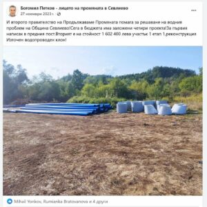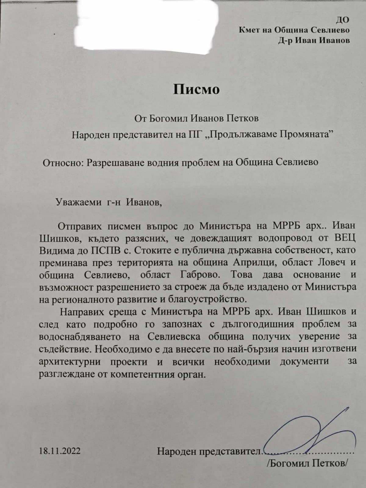 .На 18.11.2022 г. в писмо до кмета на Севлиево, лицето на промяната Богомил Петков твърди, че подробно е запознал с водния проблем на града министъра на регионалното развитие и благоустройството арх. Иван Шишков и той го е уверил, че ще разреши строежа на довеждащия водопровод от ВЕЦ Видима до ПСПВ Стоките, нищо, че е публична държавна собственост на територията на три общини (Габрово, Ловеч и Априлци).
