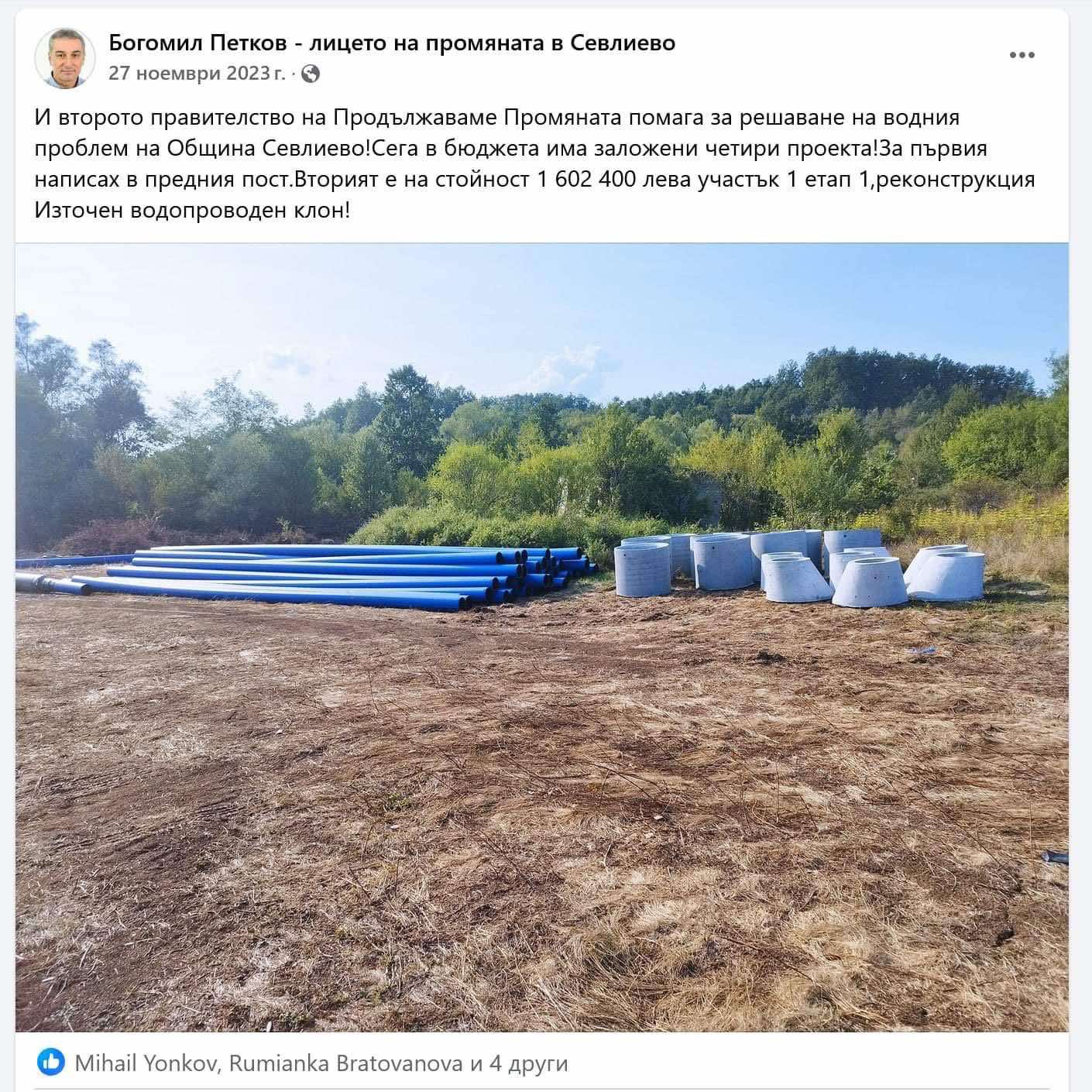 Севлиево остава с безводие и проблеми с питейната вода благодарение на „лицето на промяната“ Богомил Петков, депутат от ППДБ. Благодарение на довереното лице на партийния номад Явор Божанков процедурата за изграждане на довеждащ водопровод до града е блокирана, пише сайтът razkritia.com.