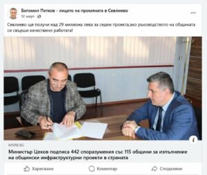 Дейността е от плетиво, през снегопочистване, та до бетонов възел.За съгражданите му, обаче, това остава скрито зад безброй бездарни постове в социалните мрежи, в които се хвали как бил уговорил финансиране за община Севлиево. Веднъж съобщава за “3 проекта в рамките на заделен фонд от 1 млрд. лв. от бюджет 2024 г.” После твърди, че кабинетът Денков ще изсипе една торба пари за реконструкция на водопроводи,” после същият кабинет щял да финансира няколко проекта в Севлиево, като до толкова се заплита сам в лъжите си, стигайки на собствения си профил във Фейсбук до предизборни обещания за 5 338 400 лв. за реконструкция на довеждащия водопровод.