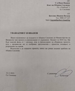 “Необходимо е да внесете по най-бързия начин изготвени архитектурни проекти и всички необходими документи за разглеждане от компетентния орган”, настоява в писмото Богомил Петков.