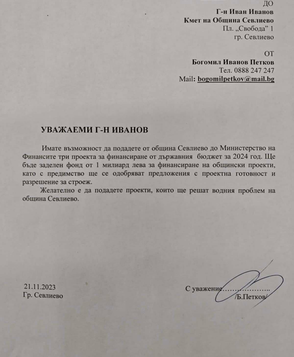 Той знае, че проектите са публична държавна собственост, видно от писмото му до общината, нарочно манипулира съгражданите си и изчаква изборите, за да провали проекта. Дори сам се хвали в местния телевизионен канал, че е насъскал Божанков да отправи питане дали МРРБ може да финансира обекти публична държавна собственост. Оказва се, че не може. И така, благодарение на Богомил Петков, на Божанков и на „Промяната“, Севлиево губи възможността да ремонтира и този участък.