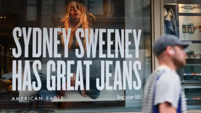 Актуалната кампания на емблематичния моден гигант *American Eagle* със слогана „Sydney Sweeney has great jeans“ („Сидни Суини има страхотни дънки“)