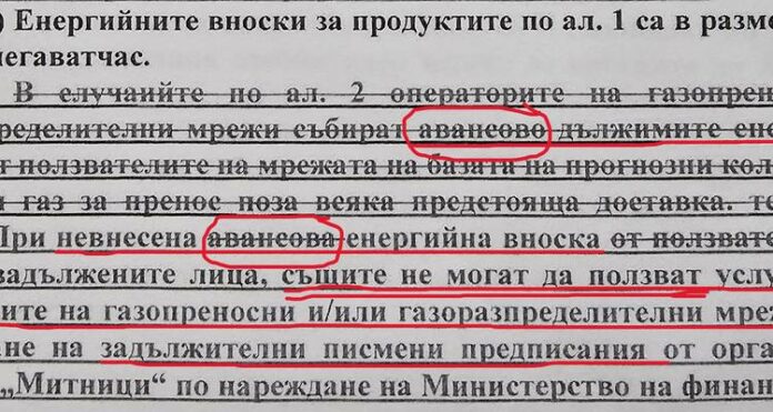 Именно в този смисъл управляващите обмислят ново предложение, Агенция „Митници“ да си събира „енергийните вноски“ от „Газпром Експорт“. В проекта за промени върху закона Министерството на финансите предлага още по-голямо задълбочаване на недоразумението, вместо да прекратят дилетантщините във фискалните инструменти. В чл. 5в, алинея 4 Министерството на финансите се е сетило за фрапираща глупост. Че операторите на газопреносни и газоразпределителни мрежи трябва да събират АВАНСОВО дължимите енергийни вноски от ползвателите на мрежата на базата на прогнозни количества газ за пренос. И още нещо, че ПРИ НЕВНЕСЕНА ЕНЕРГИЙНА ВНОСКА ЗАДЪЛЖЕНИТЕ ЛИЦА НЕ МОГАТ ДА ПОЛЗВАТ УСЛУГИТЕ НА ОПЕРАТОРИТЕ И ГАЗОРАЗПРЕДЕЛИТЕЛНИТЕ МРЕЖИ. Това ще рече, че всеки който купува и пренася руски газ, ще бъде лишен от правото да ползва услугите на операторите.