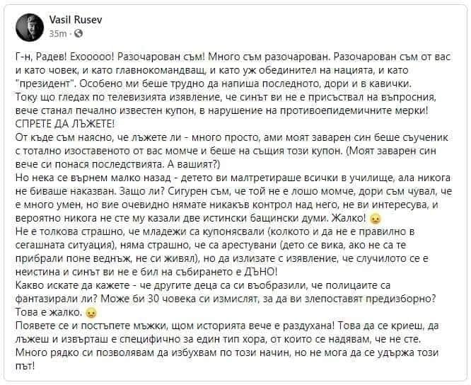 Потребител на Фейсбук представил се като родител на момче, участвало в скандалния купон със сина на президента Румен Радев написа гневно писмо в социалната мрежа. Ето какво пише Vasil Rusev: