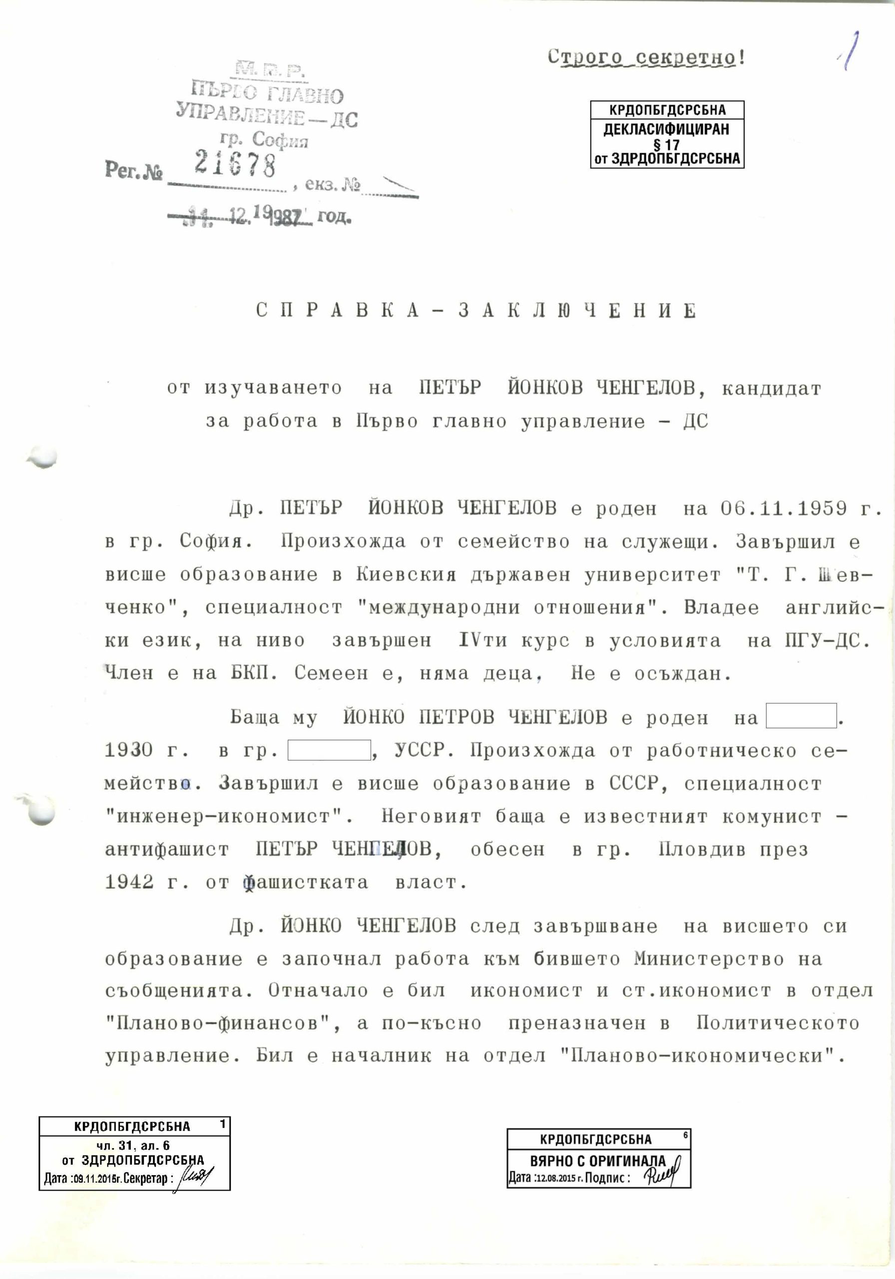 Представям Ви още един невъзможен според моите морални и ценностни мерки случай, който описва цялата перверзия на управлението на Иван Костов и СДС. За началник на регионалното бюро на Интерпол в България през 1997 г. е назначено лицето Петър Йонков Ченгелов. Да, да, по-наблюдателните от Вас веднага разпознаха в него внук на комунистическият функционер Петър Ченгелов, обесен през 1942 г. за просъветски бандитизъм. Ченгелов е назначен за кадрови служител на ПГУ-ДС с личното ходатайство на тогавашния министър на МВР Димитър Стоянов (Архив на КРДОПБГДСРСБНА, Лично кадрово дело (ЛКД) на Петър Йонков Ченгелов, а.е. А-1454, л. 10).