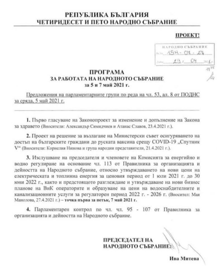 Предложението е посочено в т. 2 от проекта на Програма за работата на НС за 5 май.