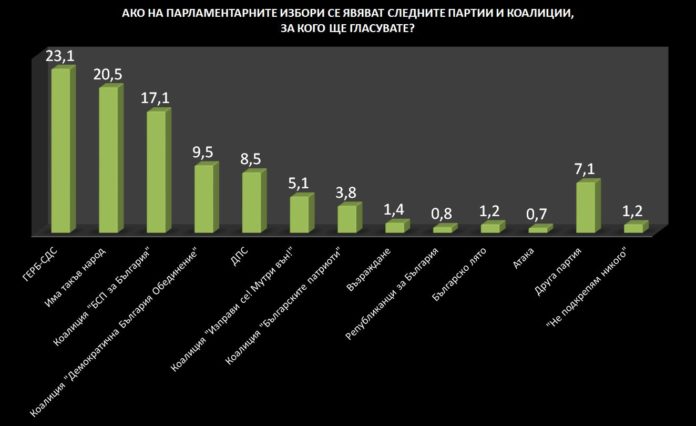 Методът за формиране на извадката е пряко стандартизирано интервю „лице в лице“.На четвърта позиция в електоралната подредба е коалиция „Демократична България“ с 9,5%. Следва ДПС с 8,5%, като уговорката тук е, че не е отчетен потенциалният вот от Турция, който ще направи резултата на тази партия осезаемо по-висок.