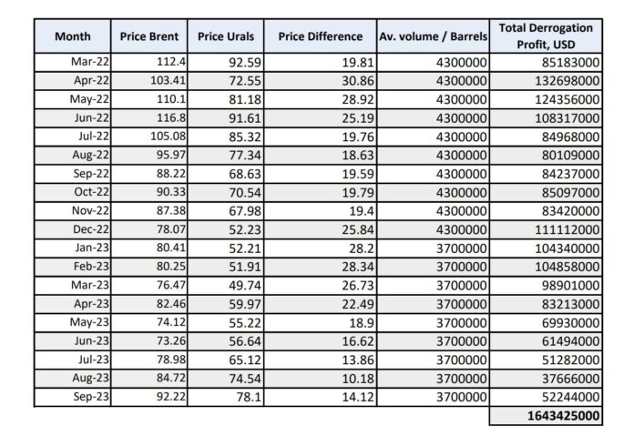 От началото на войната в Украйна и санкциите към Русия, руският петрол започна да се търгува много по-евтино от останалия петрол. Руският петрол е сорт Urals и неговата цена по месеци е нанесена в третата колонка. Във втората колонка е цената на петрол сорт Brent, който купуват останалите държави. В четвъртата колонка е разликата в цената между брента и руския уралски нефт в американски долари за един барел. За първия месец например е 19.81 на барел за месец март 2022 година. В петата колонка е средния обем барели за 2022 и 2023, които е купувал Лукойл.