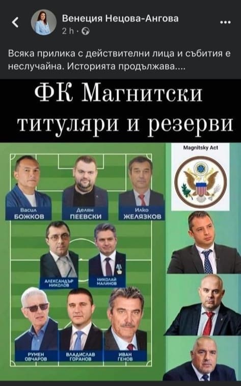 член на изпълнителния съвет на партия „Продължаваме промяната“ и заместник – председател на ПГ на ПП в 48-то НС – г-жа Венеция Ангова да определя списък на санкционирани в бъдеще по закона „Магнитски“ лица чрез профила си в социалните мрежи?