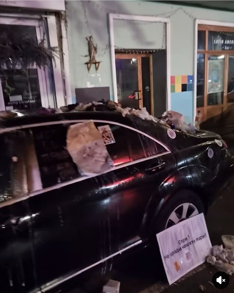Тази кола не знам чия е, ще да е много лош тоя човек, щом Добрите сили така жестоко са му отмъстили. Коментират, че била станала страхотна артинсталация, кефят се яко, щото не е бил хич лесен тоя демократичен акт – о€рали са я подробно от броня до броня и са смогнали да принтират лозу̀нг на А4 формат: