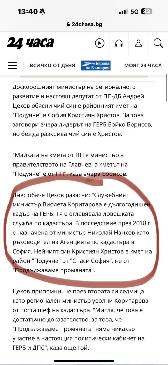 Не е добре по принцип да се лъже. Но да използваш лъжа за политическа манипулация, както прави бившият регионален министър Адрей Цеков по адрес на приемничката си на поста, не е и почтено. Лесно проверимо е, че служебният регионален министър Виолета Коритарова никога не е оглавявала кадастъра в Ловеч. Вероятно Цеков споменава града, защото аз съм народен представител от Ловешка област и се опитва да направи евтино внушение. Мога със сигурност да заявя, че тя никога не е била и кадър на ГЕРБ.