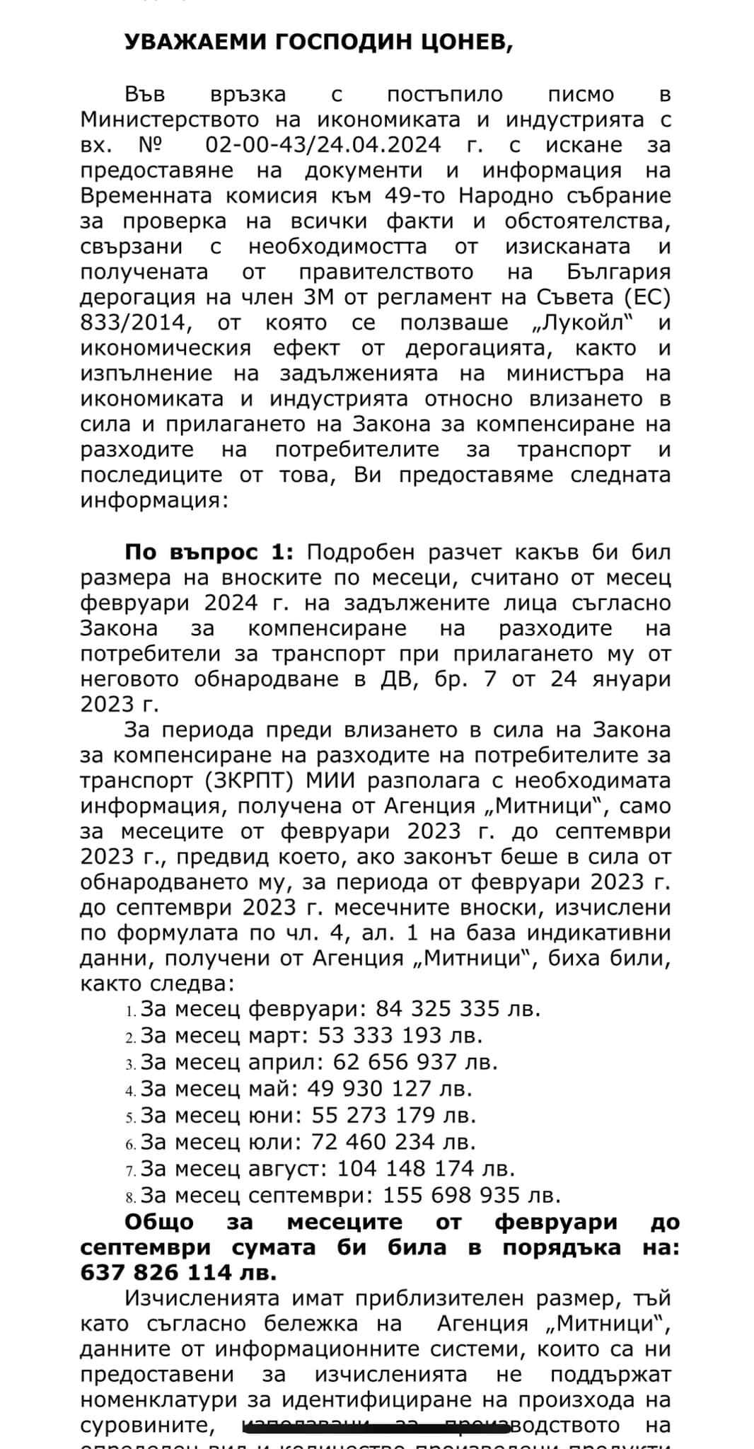 - Въпреки приетият от НС закон за 1 лев компенсация на горивата, той е блокиран от МС в продължение на 10 месеца от което България губи 638 милиона само за 8 от 10 месеца (прилагам официален отговор от Министерство на икономиката за загубените средства).