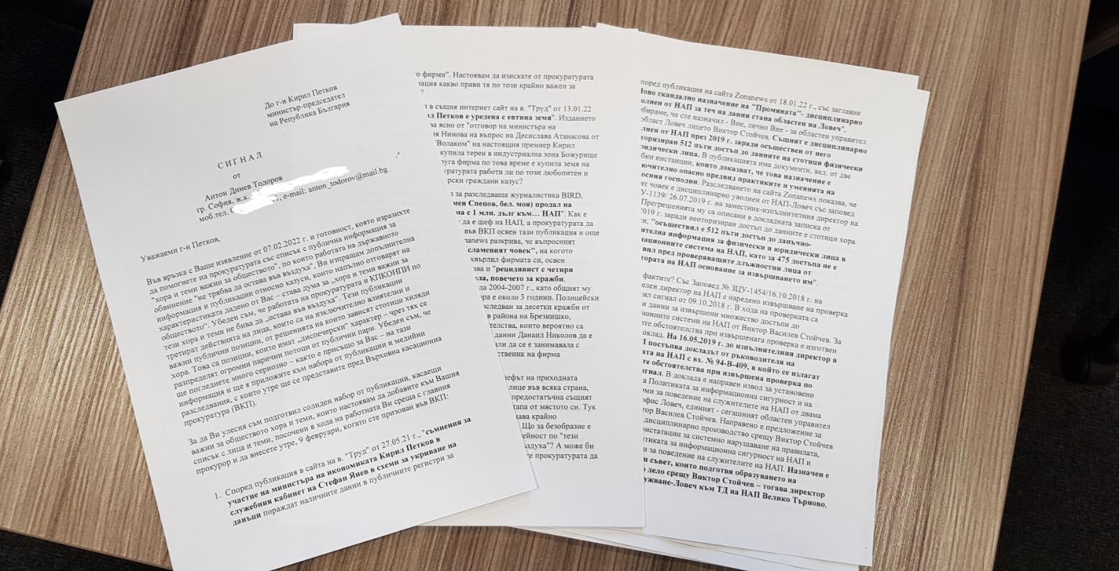 Във връзка с Ваше изявление от 07.02.2022 г. и готовност, която изразихте да помогнете на прокуратурата със списък с публична информация за „хора и теми важни за обществото“, по които работата на държавното обвинение „не трябва да остава във въздуха“, Ви изпращам допълнителна информация и публикации относно казуси, които напълно отговарят на характеристиката дадено от Вас – става дума за „хора и теми важни за обществото“. Убеден съм, че работата на прокуратурата и КПКОНПИ по тези хора и теми не бива да „остава във въздуха“. Тези публикации третират действията на лица, които са на изключително влиятелни и важни публични позиции, от решенията на които зависят стотици хиляди хора. Това са позиции, които имат „диспечерски“ характер – чрез тях се разпределят огромни парични потоци от публични пари. Убеден съм, че ще погледнете много сериозно – както е присъщо за Вас – на тази информация и ще я приложите към набора от публикации и медийни разследвания, с които утре ще се представите пред Върховна касационна прокуратура (ВКП).
