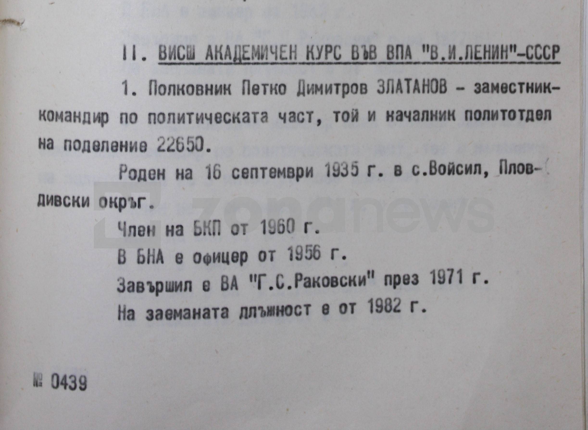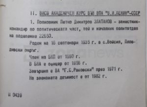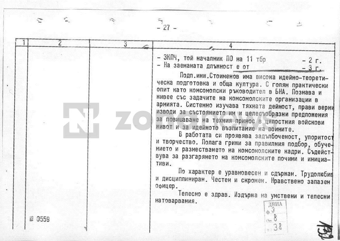 Нека видим какви качества и „експертиза“ има Стоимен Стоименов. Четем „План – предложение за обсъждане в Колегиума на МНО разстановката на политическите офицери от българската народна армия – номенклатура на Колегиума и на ЦК на БКП на заседанието на 29.08.1983 г. Тук подполковник Стоимен Цветанов Стоименов е описан с всички подробности.