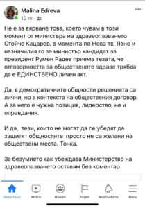 „Не е за вярване това, което чувам в този момент от министъра на здравеопазването Стойчо Кацаров по Нова Тв. Явно и назначилият го за министър кандидат-президент Румен Радев приема тезата, че отговорността за общественото здраве трябва да е ЕДИНСТВЕНО личен акт.