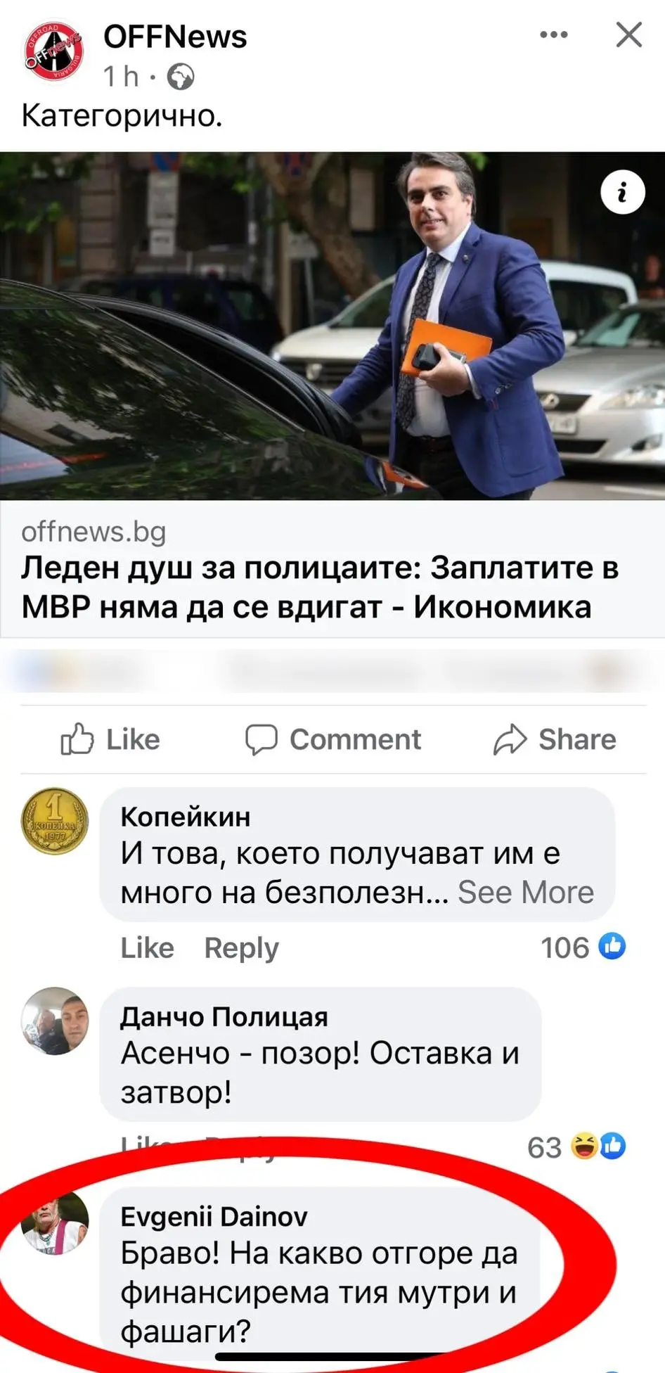 Дайнов коментира възторжено темата под публикация на Offnews.