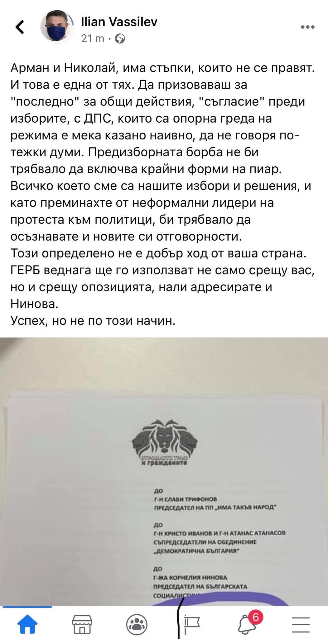 „Арман и Николай, има стъпки, които не се правят. И това е една от тях. Да призоваваш за „последно“ за общи действия, „съгласие“ преди изборите, с ДПС, които са опорна греда на режима е мека казано наивно, да не говоря по-тежки думи. Предизборната борба не би трябвало да включва крайни форми на пиар.