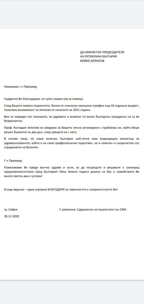 Сдружението на пациентите със спинална мускулна атрофия /СМА/ благодари в писмо на премиера Бойко Борисов за решаващата му намеса, след която болните над 18-годишна възраст получиха възможност за лечение от началото на 2021 г.