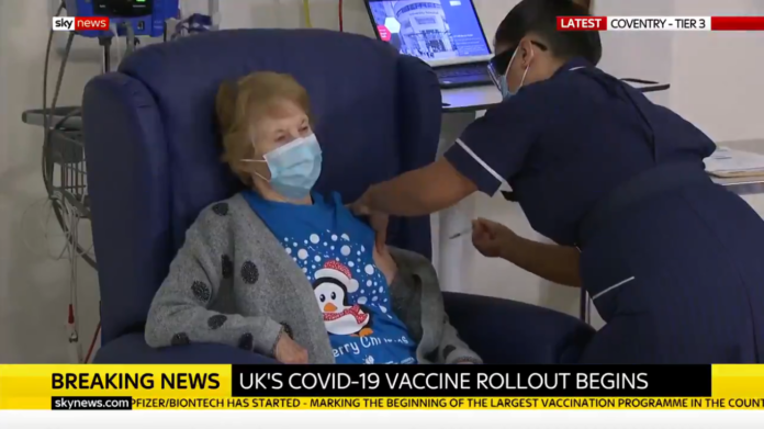 Маргарет Кийнън, на 90 години, стана първият човек в света, който получи медикамента като част от програма за ваксинация на Великобритания.