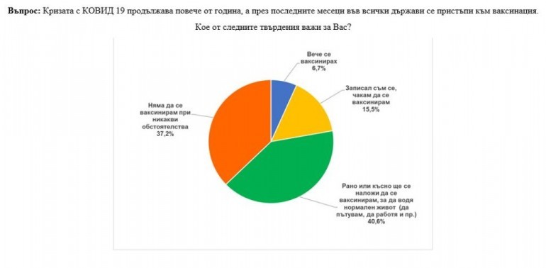 Други 6,7% посочват, че вече са се ваксинирали, а 15,5% са се записали и чакат да се ваксинират. Общо 62,8% от интервюираните българи мислят, че пътят им към бъдещ нормален живот минава през ваксиниране.