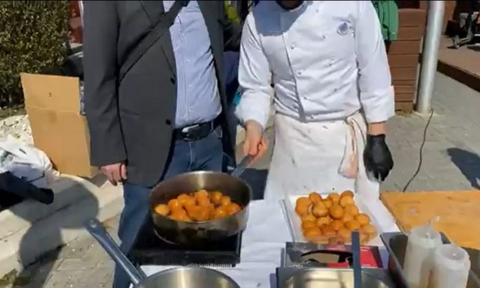„Вземете си поничка и гласувайте за нас”, призовава готвачът шеф Филип Спасов, докато върти поничките в тигана.