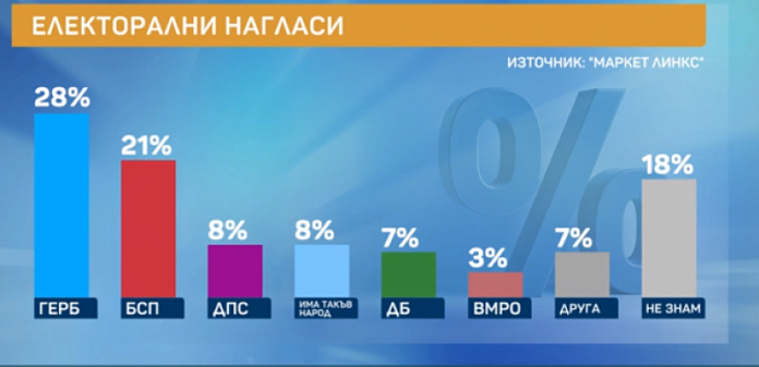 При електоралните нагласи също се отчита сериозно изместване на пластовете. Подкрепата за управляващата партия ГЕРБ нараства значително – 28%, следвана от БСП с 21% подкрепа и ДПС и „Има такъв народ“ на Слави Трифонов – с 8%.