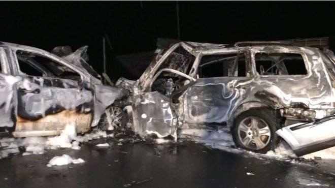 Когато пожарната пристигнала на място пламъците били погълнали и двете коли, като двамата шофьори останали в огнен капан, неспособни да се спасят навън. Говорител на полицията заяви, че още не е ясна причината за челния удар към 3 ч в нощта на Коледа.