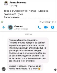 Учениците от 8 „г“ клас, на които Радославова е била класен ръководител, са много разстроени от загубата и се обърнаха с молба към учителите си да учат дистанционно.