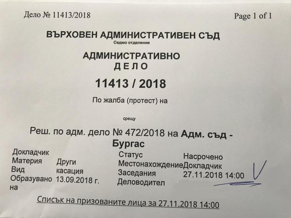 Видно от разменена писмена кореспонденция чрез мобилно приложение на 27 септември 2018 г. „Prezident-Pl. Uzunov” пише до П.Б.: „Чакам номерчето.“ Отговорът на П.Б. до „Prezident-Pl. Uzunov” съдържа снимка, която предоставя информация за образуваното две седмици по-рано (на 13 септември 2018 г.) административно дело по протест срещу предхождащо решение на Административен съд-Бургас. Самото заседание на ВАС по конкретното адм. дело е насрочено за 27 ноември 2018 г.