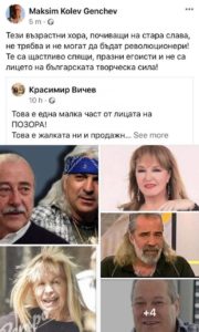 Снимки на Кирил Маричков, Васко Кръпката, Лили Иванова, Маргарита Хранова, Андрей Слабаков, Георги Мамалев, Марта Вачкова, Силвия Кацарова, Иван и Андрей се разпространяват в протестърски среди в социалните мрежи. „Това е една малка част от лицата на ПОЗОРА!“, пишат недоволните, които са бесни на хората на изкуството, че не подкрепят протеста им срещу властта.