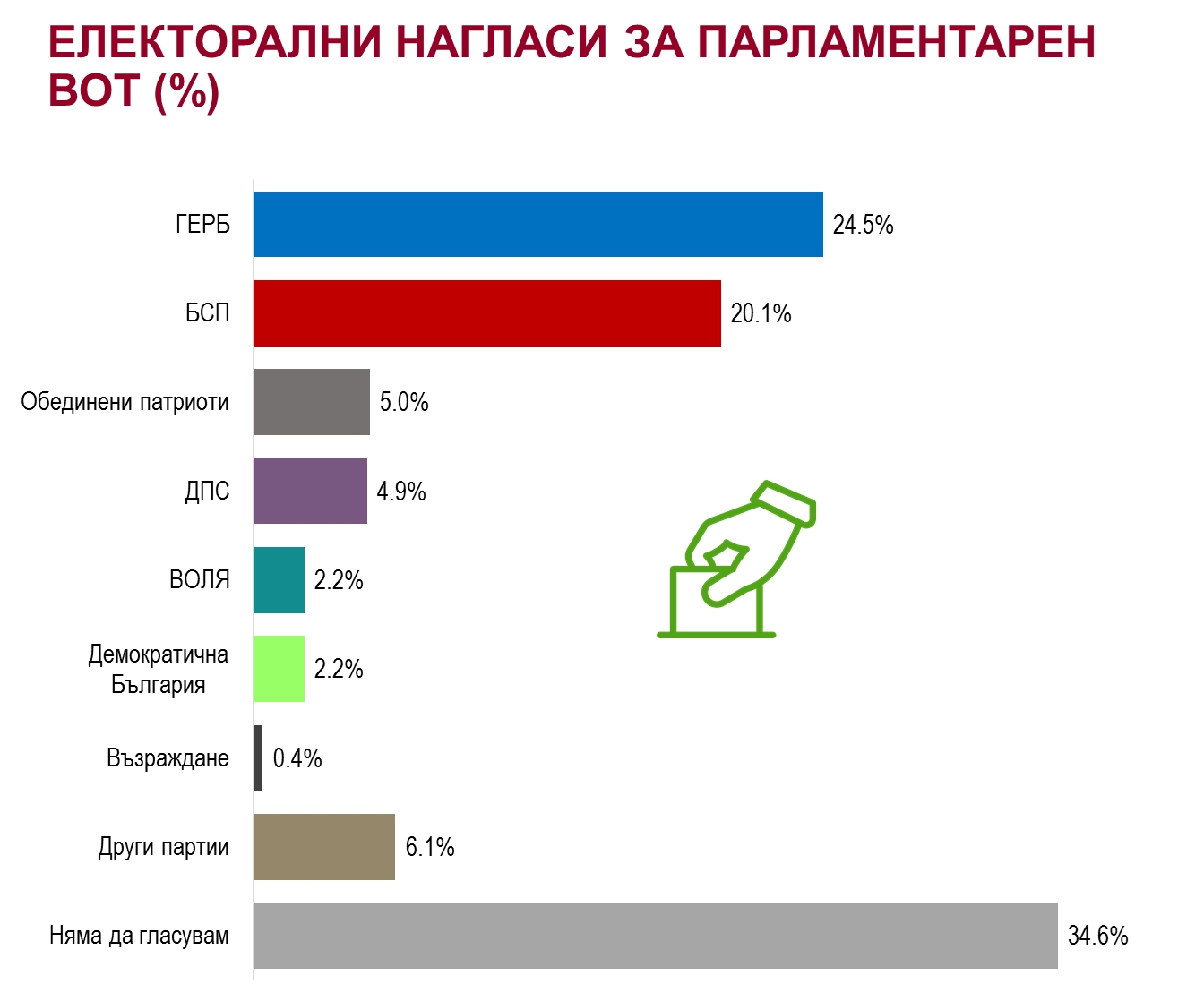 Електоралните нагласи за евентуален парламентарен вот се запазват без съществени промени. ГЕРБ постига ръст от 1.5% спрямо март и остава първа политическа сила (24.5%), следвана от БСП (20.1%). Обединените патриоти отбелязват лек спад (до 5.0%) и почти се изравняват с ДПС (4.9%). С 2.2% подкрепа Воля е под 4%-та бариера.