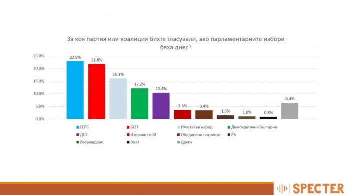 Пет политически партии влизат в следващото Народно събрание, сочи социологическо проучване на агенция „Спектър“, направено между 12 и 16 октомври сред извадка от 1016 души чрез пряко стандартизирано интервю, проведено присъствено в дома на респондентите.
